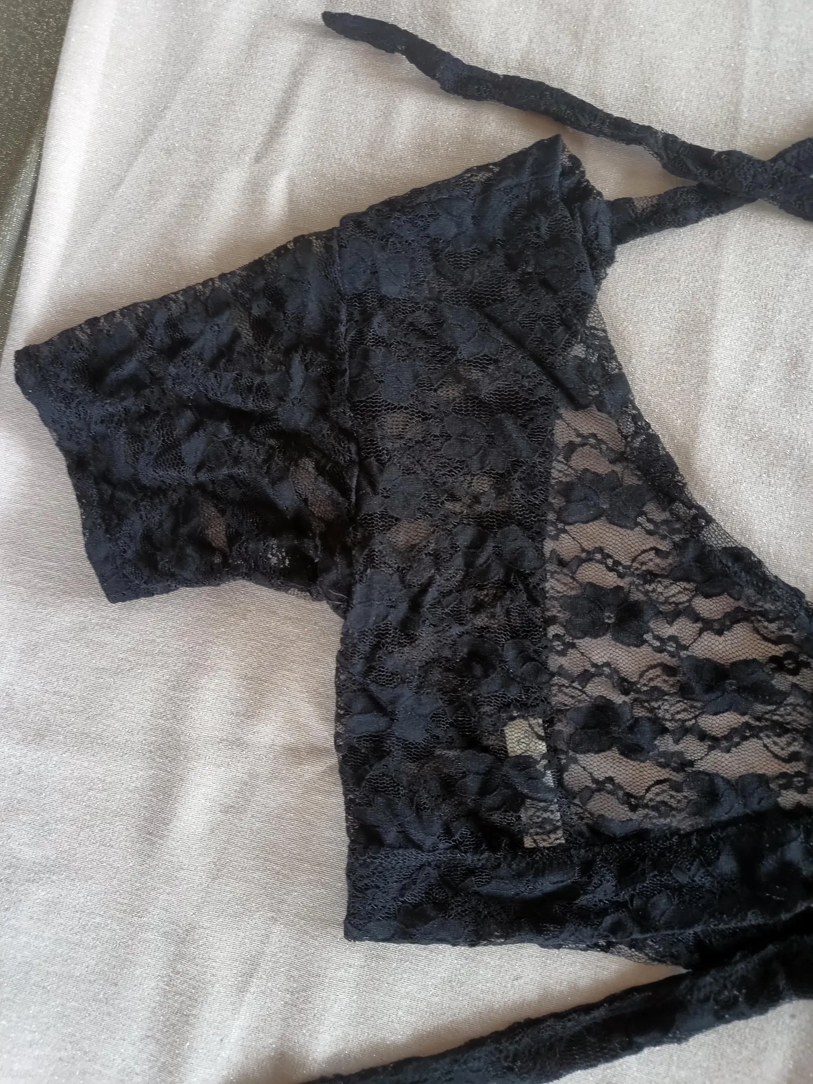 Black lace crop top with open back. Ties up at the lower back and behind the neck. Will be cut, sewn and ready to ship within 2-9 days.