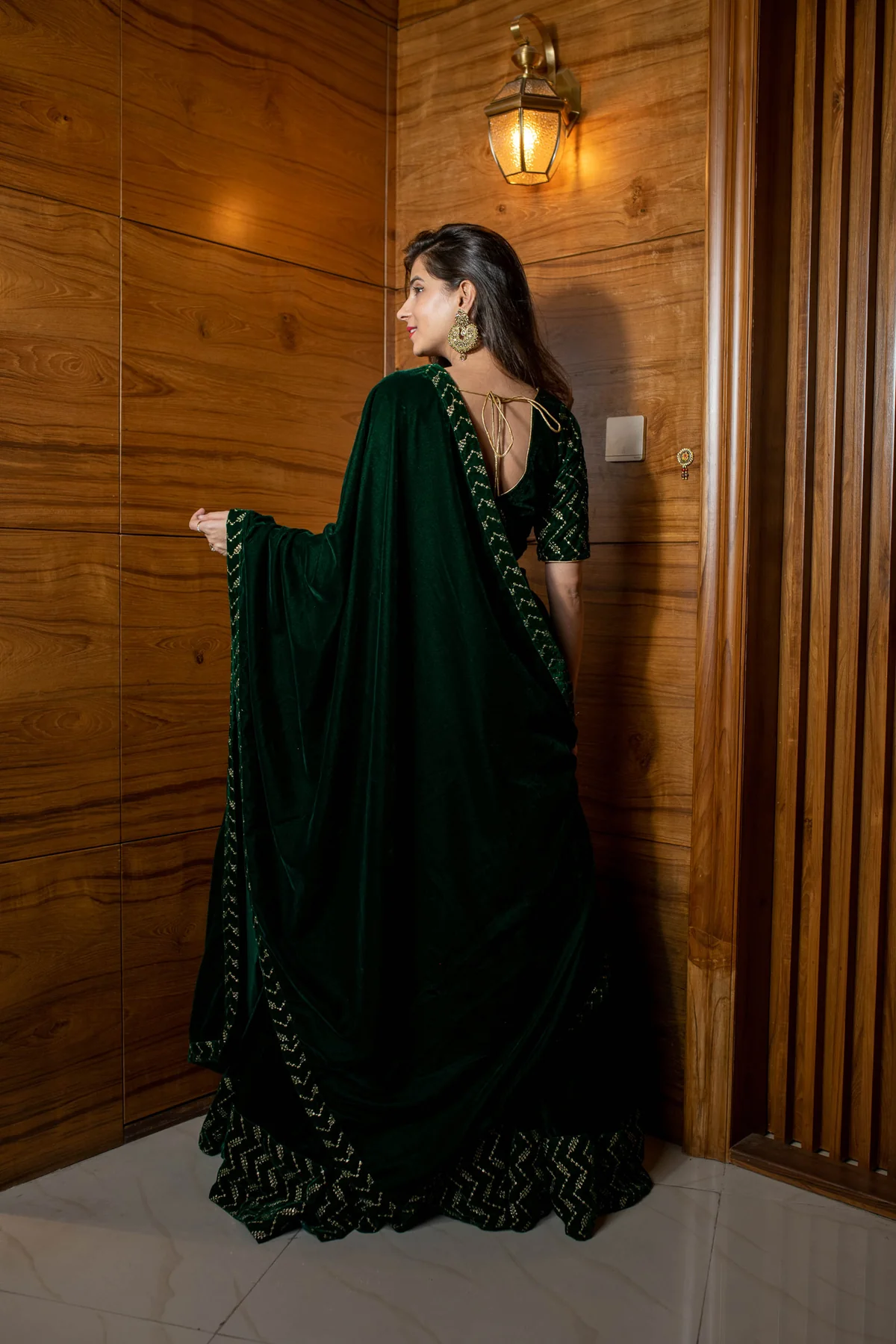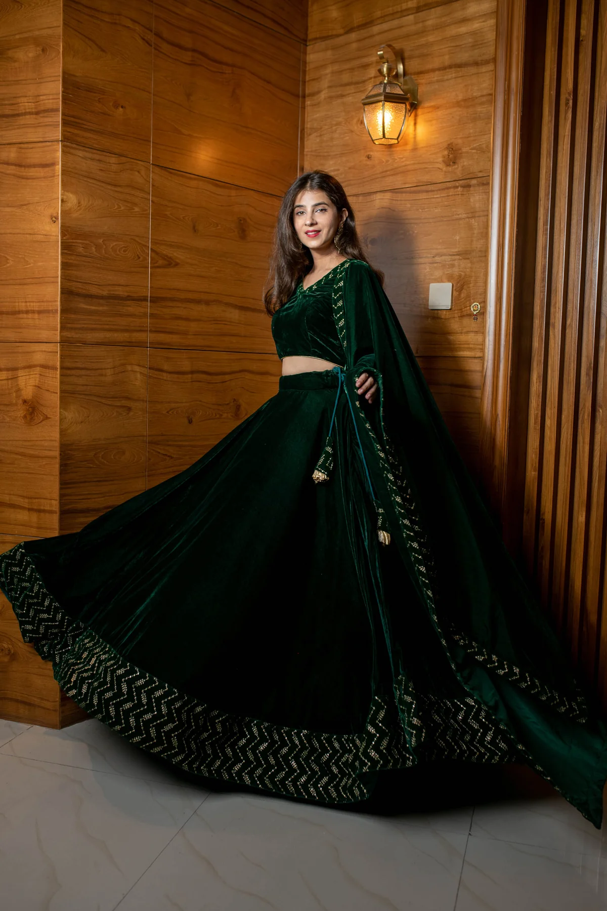 Bottle Green Sequin And Zari Work Velvet Lehenga