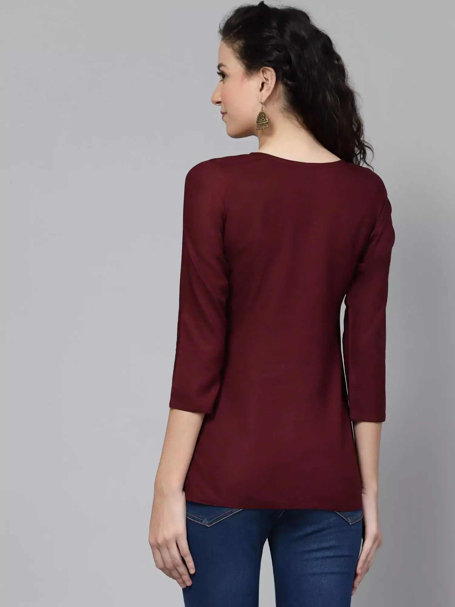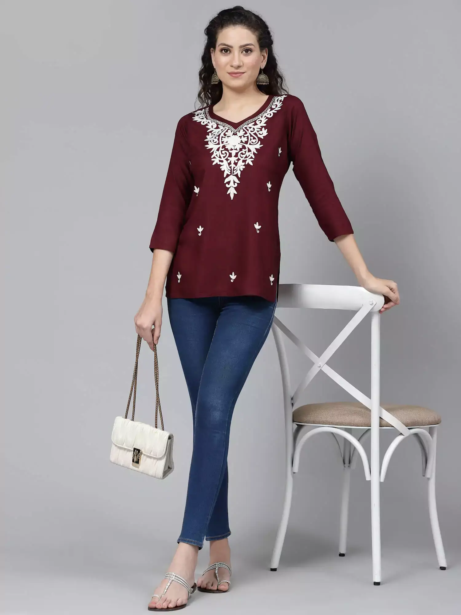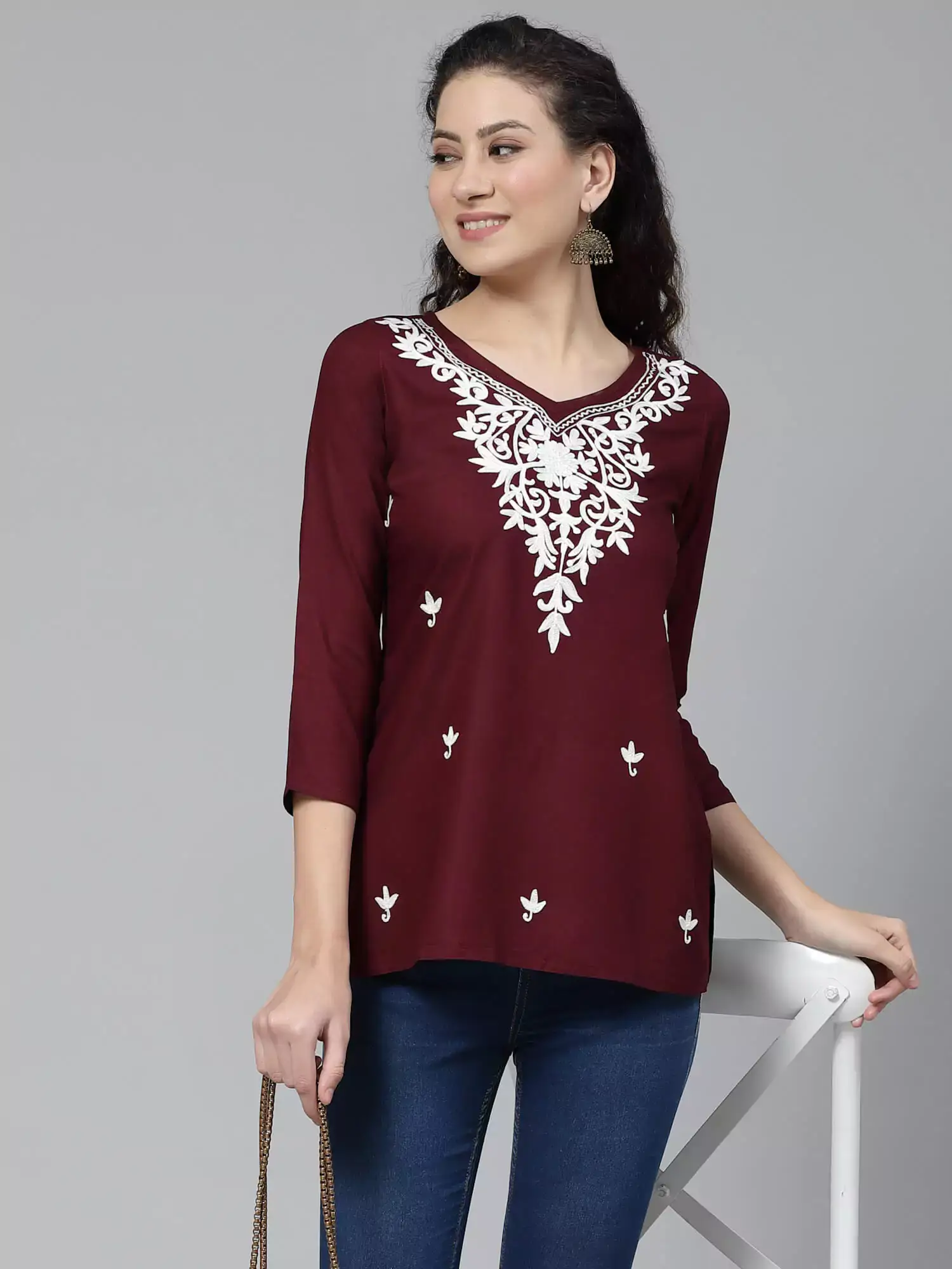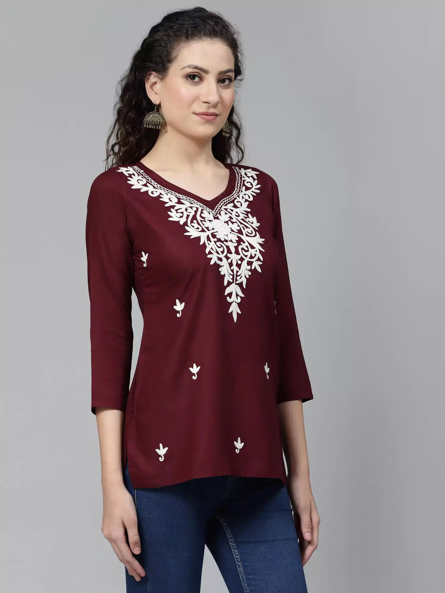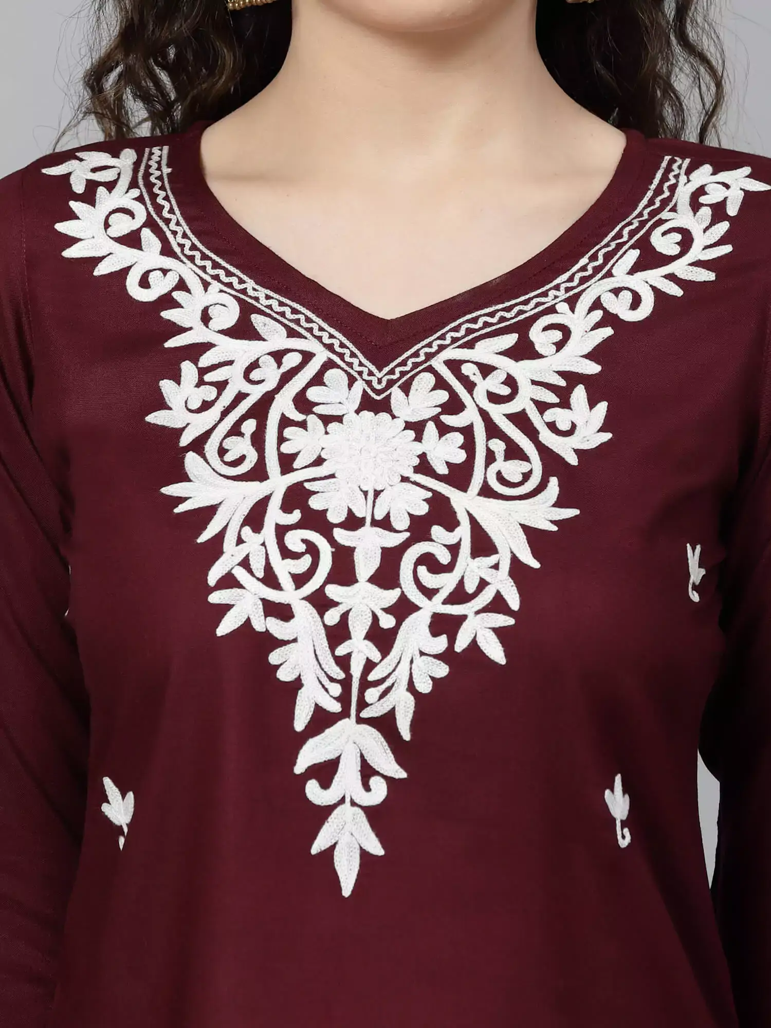 Colour: Wine Kurti-type: Short Length: 26 Inches Sleeves: Three-Quarter Sleeves Neck: Sweetheart Neck Shape: Straight Embroidery: Kashmiri Embroidery- 100% Authentic Fabric: Rayon Cotton Wash care: Handwash Do not scrub the product and Dry in shade If it is a naturally dyed, Color might bleed slightly during the first few washes.