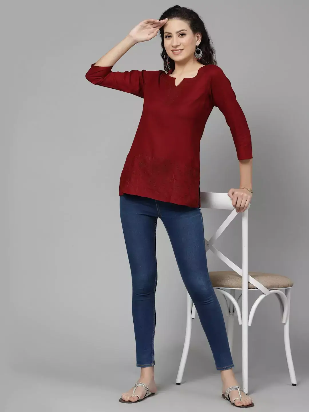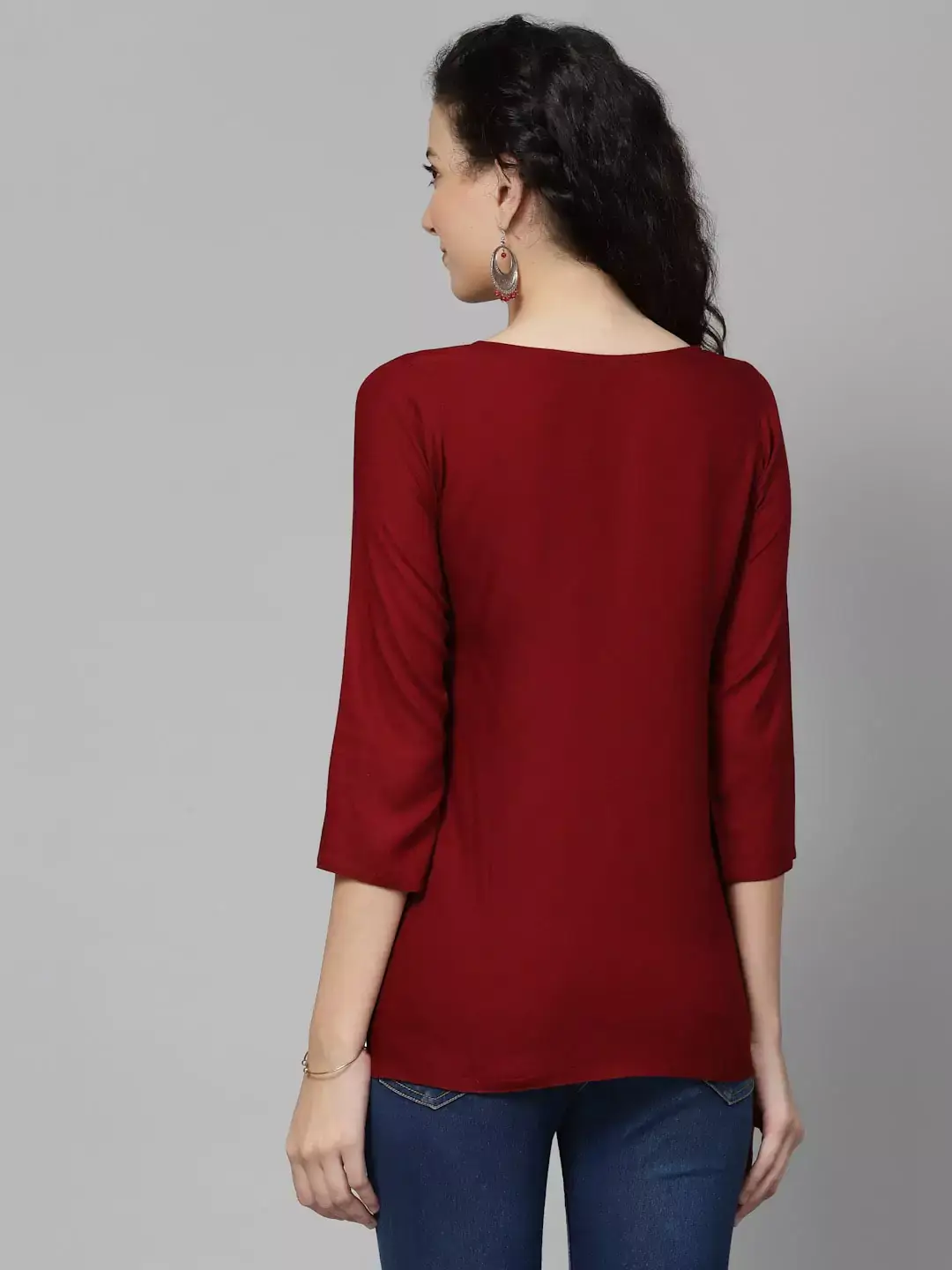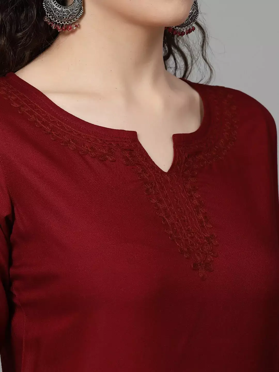 Color: Maroon Kurti-type: Short Length: 26 Inches Sleeves: Three-Quarter Sleeves Neck: Keyhole Neck Shape: Straight Embroidery: Aari work using Multi-color Cotton Thread Fabric: Rayon Cotton WashCare: Handwash Do not scrub the product and Dry it in the shade If it is naturally dyed, the color might bleed slightly during the first few washes.