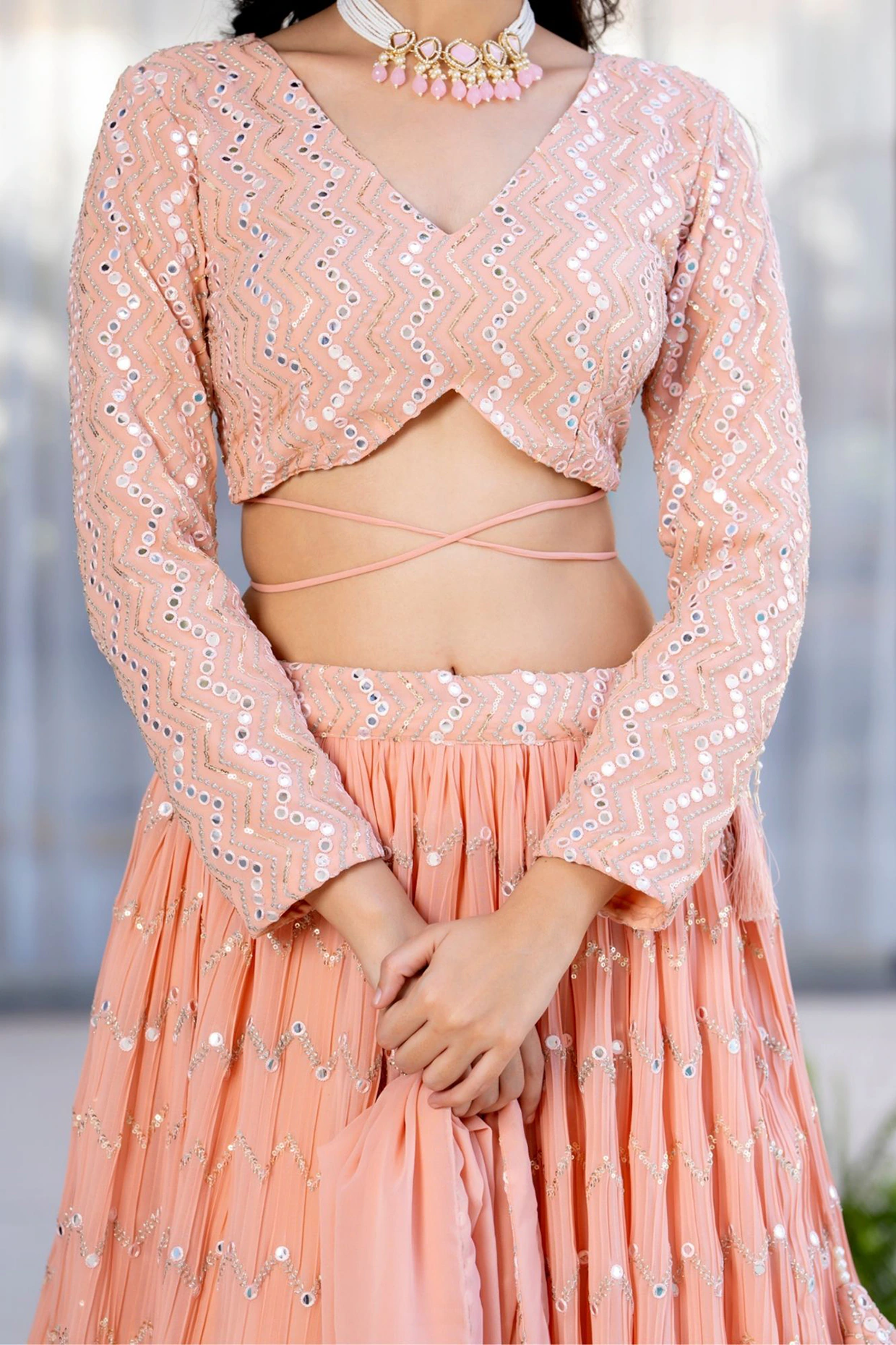 PRODUCT DESCRIPTION Featuring a peach lehenga in georgette base with latkans and mirror work. It is paired with a blouse and a dupatta. Accentuate it with dangler earrings and heels for festive occasions or wedding ceremonies.