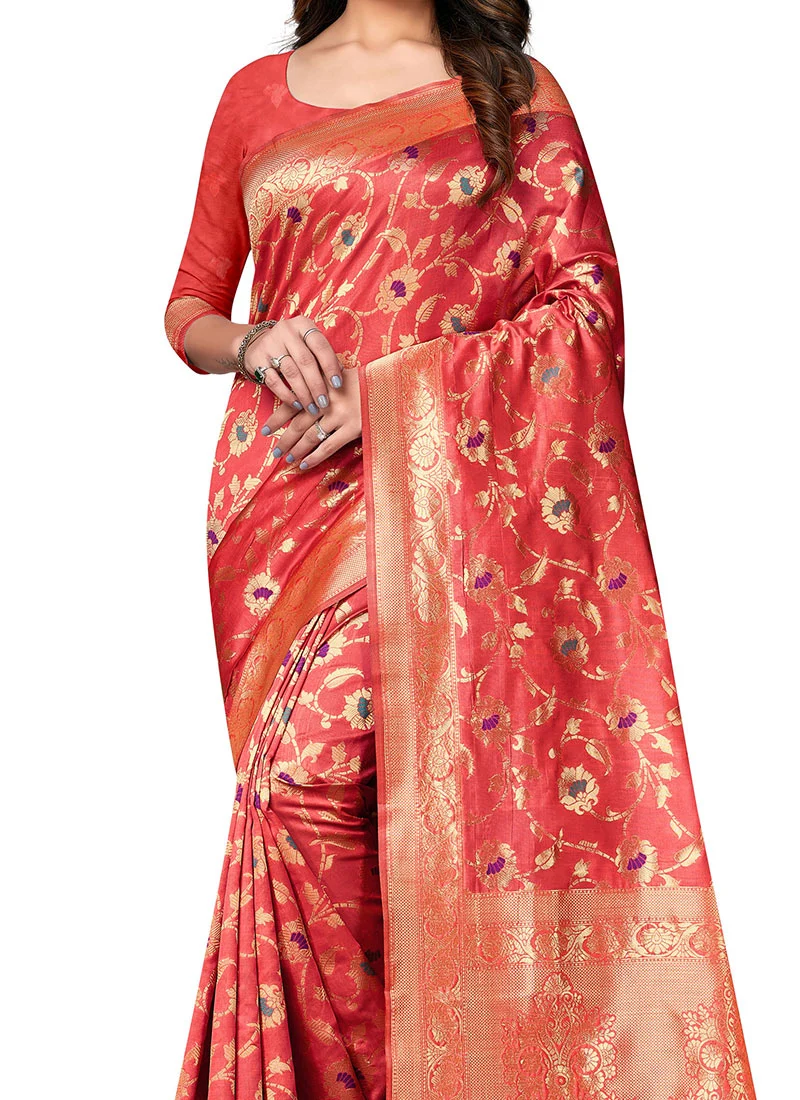 No matter how you feel, get up and wear this red color banarasi silk saree. This attractive saree comes with zari weaving work all over the attire, with a creative design and border that looks chic and ideal. This saree comes with an unstitched red color banarasi silk blouse.