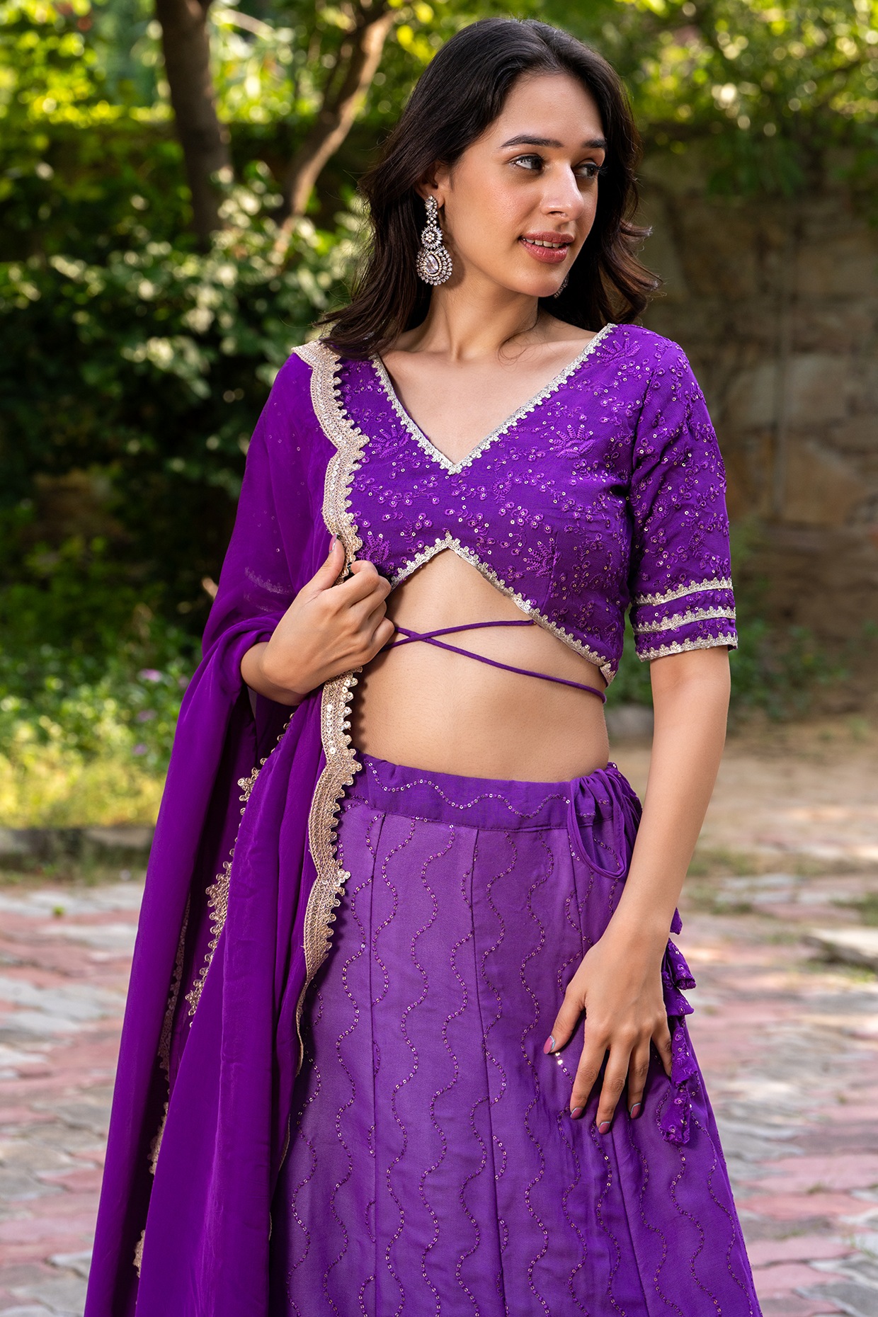 Featuring a violet lehenga in georgette base with embroidery and lace detailing on the hem. It is paired with a sequin-embroidered blouse and an organza dupatta. Accentuate it with dangler earrings and heels for a wedding or festive occasion.