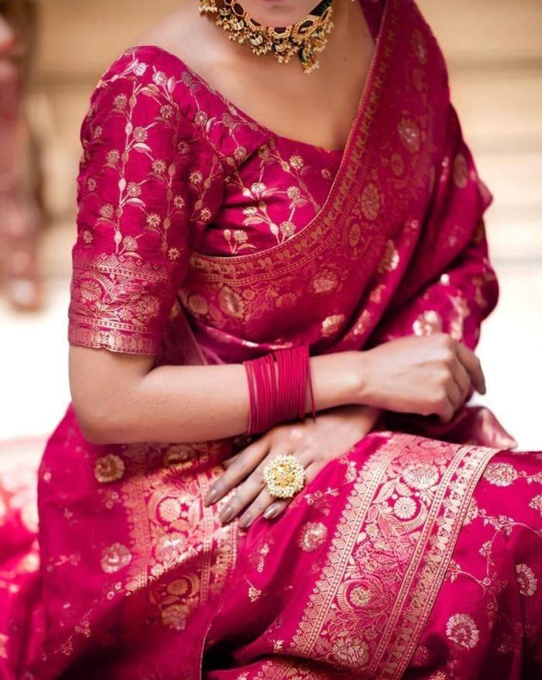 Blouse piece length: 0.8 m Saree length: 5.5 m Package contains: 1 saree with blouse piece The last image gives a detailed look of the blouse piece that comes with this saree (The model is wearing a blouse from our in-house wardrobe) Dry clean Silk